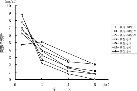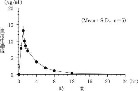 健康成人に本剤200mg(力価)を1時間かけて点滴静注したときの血清中濃度は、図1のとおりで、薬物動態パラメータは、表1のとおりであった。また、75mg(力価)又は100mg(力価)を1時間かけて点滴静注又は筋注したときの薬物動態パラメータは、表1のとおりであった1),2),3)。