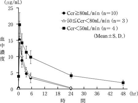 また、クレアチニン・クリアランス(Ccr)が50未満の患者の24時間までの尿中排泄率は56.9%でCcrが100の健康成人のそれは90.3%で明らかに障害程度が高くなるにつれ、尿中排泄の遅延傾向が認められた。