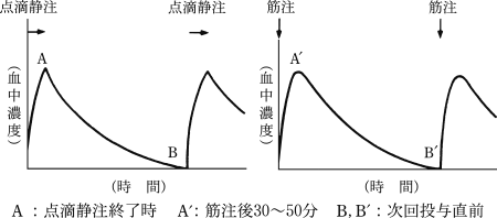 アミノグリコシド系抗生物質による副作用発現の危険性は、最高血中濃度(ピーク値)あるいは最低血中濃度(次回投与直前値)が異常に高い値を繰り返すほど大きくなるといわれており、特に本剤の場合は、最低血中濃度が2μg/mL以上が繰り返されると第8脳神経障害や腎障害発生の危険性が大きくなる可能性がある。また、最高血中濃度は薬効と関係しており、本剤では、その標準的な目安は9~20μg/mLと考えられている。特に新生児、低出生体重児、高齢者及び大量投与患者では適切な間隔で最高血中濃度(A,A′)と最低血中濃度(B,B′)を測定し、異常な高値を示す場合には、次回投与より投与量や投与間隔を調整することが望ましい。例えば、異常に高い最高血中濃度が繰り返されている場合は投与量を減量し、異常に高い最低血中濃度が繰り返されている場合は投与間隔を延長するなど調整を行う。,,,