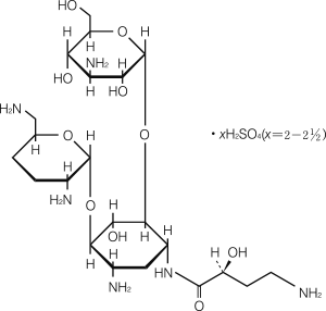 3-Amino-3-deoxy-α-D-glucopyranosyl-(1→6)-[2,6-diamino-2,3,4,6-tetradeoxy-α-D-erythro-hexopyranosyl-(1→4)]-1-N-[(2S)-4-amino-2-hydroxybutanoyl]-2-deoxy-D-streptamine sulfate
