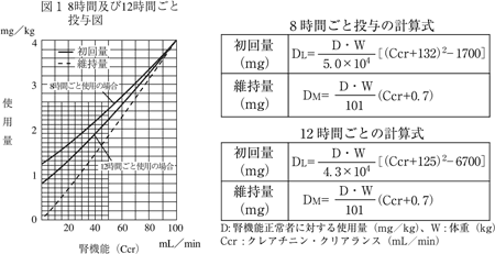 体重及びクレアチニン・クリアランスを用い、図1又は計算式より求めた初回量及び維持量を投与する1)。