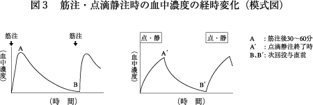 アミノグリコシド系抗生物質による副作用発現の危険性は、一過性であっても異常に高い最高血中濃度(ピーク値)が繰り返されるほど大きくなり、また、異常に高い最低血中濃度(谷間値――次回投与直前値)が繰り返されるほど大きくなるといわれている。本剤の場合は、第8脳神経障害や腎障害発生の危険性が大きくなるといわれている。腎機能障害患者、新生児、未熟児、高齢者及び大量投与患者などでは血中濃度が高くなりやすいので、初回投与時において、また長期間投与患者においても適当な間隔で最高血中濃度(A、A')と最低血中濃度(B、B')を測定し(図3参照)、異常な高値を示す場合には、次回投与より投与量や投与間隔を調整することが望ましい。例えば、異常に高い最高血中濃度が繰り返されている場合は投与量を減量し、異常に高い最低血中濃度が繰り返されている場合は投与間隔を延長するなど調整を行う。,,,,,,