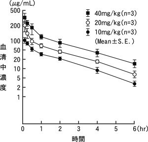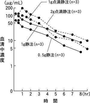 腎機能の正常な成人男子に静脈内投与した場合の血清中濃度の推移は図1、表1に示したとおりで、用量依存性を示した2)。
