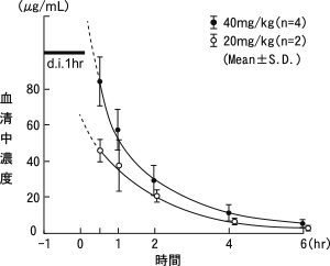 腎機能の正常な小児患者に40mg/kg、20mg/kgを1時間で点滴静注した時の血清中濃度は図3、表3に示したとおりで、用量依存性を示した4)。