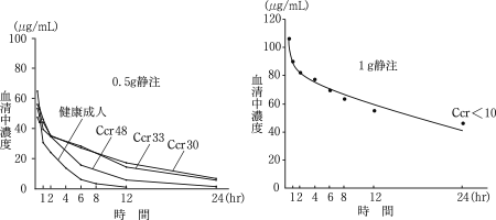 腎機能障害成人患者の尿中排泄率は、高度腎障害(Ccr<10)に1g静注した場合24時間までで約10%、中等度障害者(Ccr=48)に0.5g静注した場合6時間までで約50%、12時間までで約63%であった11),12)。