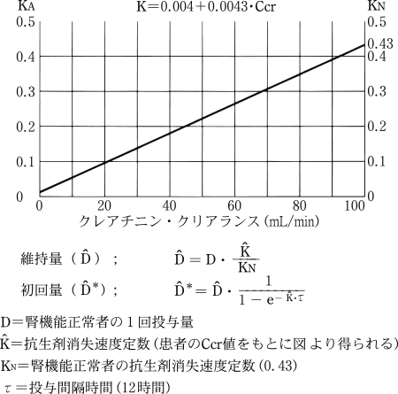Ccrを用い、図及び計算式より求めた初回量及び維持量を投与する。
