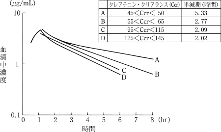 腎機能正常成人男子(n=4)に、本剤100mgを筋注あるいは、50mg及び100mgを1時間かけて点滴静注した時の血清中濃度を検討した。100mg筋注の最高血清中濃度は投与後0.5時間に発現し、6.83μg/mLであった。50mg点滴静注の最高血清中濃度は点滴終了時に得られ、4.37±0.26μg/mL、血中濃度半減期は1.59±0.67hr(文献から算出)であった。また、100mg点滴静注の最高血清中濃度は点滴終了時に得られ、8.41±1.81μg/mL、血中濃度半減期は1.12±0.20hr(文献から算出)であった3)。