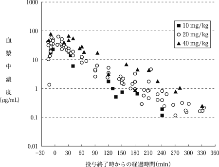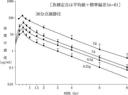 健康成人に30分点滴静注した場合の薬物動態パラメータは次表のとおりであり、血漿中濃度は投与量に依存して推移した3),4)。