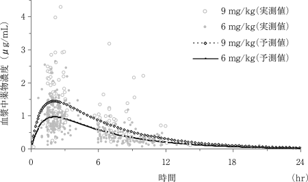 肺炎及び中耳炎の小児患者に15%細粒剤を1回6mg/kg又は9mg/kgを1日2回反復経口投与※したときの薬物動態パラメータは、下表のとおりであった[Population Pharmacokinetics(PPK)解析]。※本剤の承認用量は1回6mg/kgを1日2回である。