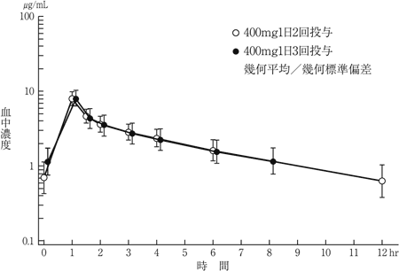 病状により必要と判断された場合には1回量として400mgを投与する。なお、クレアチニンクリアランス値(mL/min)=[体重(kg)×(140-年齢)]/[72×血清クレアチニン値(mg/dL)]、女性の場合はこれに0.85を乗ずること1)。