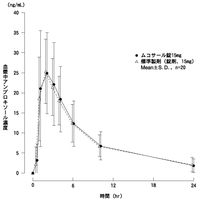ムコサール錠と標準製剤を、クロスオーバー法によりそれぞれ1錠(アンブロキソール塩酸塩として15mg)健康成人男子20名に絶食時単回経口投与して血漿中アンブロキソール濃度を測定し、得られた薬物動態パラメータ(AUC、Cmax)について統計解析を行った結果、両剤の生物学的同等性が確認された3) 。