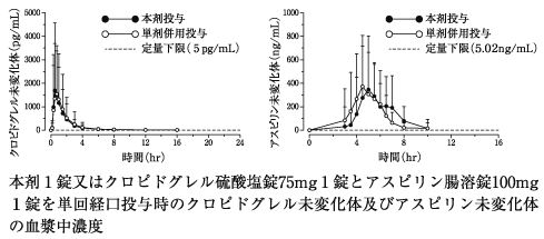 健康成人男性(18例)に本剤1錠を絶食下又は食後に単回経口投与し、クロピドグレル及びアスピリンの吸収に与える食事の影響をクロスオーバー法で検討した時のクロピドグレル及びアスピリンの薬物動態パラメータは次表のとおりであった。