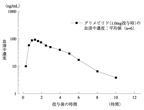 健康成人男子9例に本剤1mgを朝食直前に単回投与した時、プラセボ投与時と比べ、朝食後の血中グルコース濃度は本剤投与時において有意に低下した。この時の血清中インスリン濃度のCmaxは、プラセボ投与時と比べ本剤投与時では有意差は認められなかったが、朝食後4時間までのAUCはプラセボ投与時と比べ有意に増加した9)。ウサギ、ラット、イヌを用いた経口投与試験において、本剤の血糖降下作用は投与1時間後から認められた。グリベンクラミドとの比較では同等もしくはそれ以上の血糖降下作用を示した10)。ラットβ細胞腫を用いたin vitro試験で、β細胞上のSU剤レセプターに対してグリメピリドはグリベンクラミドに比して1/5の結合親和性を示した11)。