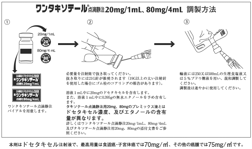 通常、成人に1日1回、ドセタキセルとして70mg/m2(体表面積)を1時間以上かけて3~4週間間隔で点滴静注する。なお、患者の状態により適宜減量すること。