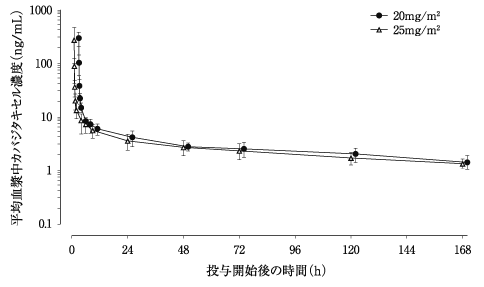 日本人前立腺癌患者にカバジタキセル20mg/m2あるいは25mg/m2を1時間で点滴静脈内投与注8) したとき、カバジタキセルの血漿中濃度プロファイルは三相性を示し、3-コンパートメントモデルにより薬物動態解析を行った4) 。