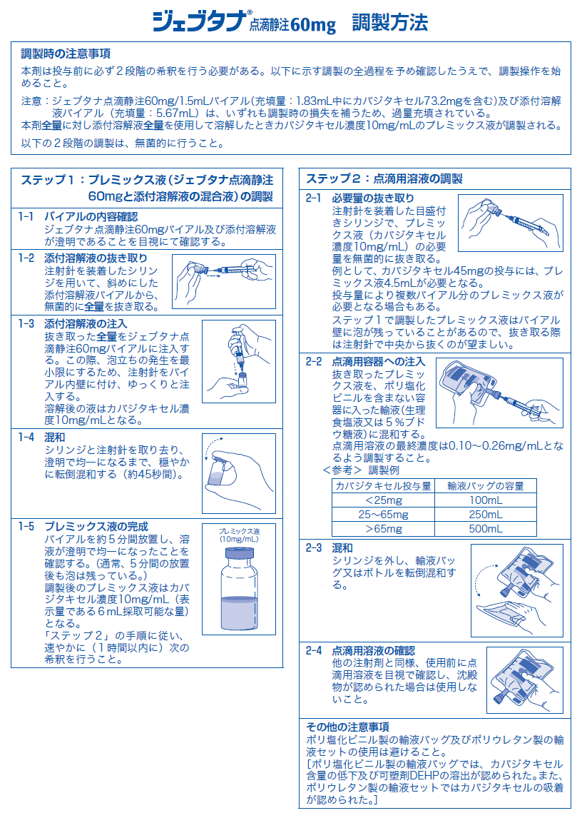 プレドニゾロンとの併用において、通常、成人に1日1回、カバジタキセルとして25mg/m2(体表面積)を1時間かけて3週間間隔で点滴静注する。なお、患者の状態により適宜減量すること。