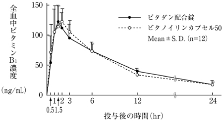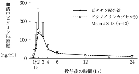 ビタダン配合錠とビタノイリンカプセル50を健康成人男子にビタダン配合錠は1錠、ビタノイリンカプセル50は1カプセル(ピリドキサールリン酸エステル水和物として30mg、フルスルチアミン塩酸塩として54.57mg)空腹時単回経口投与(クロスオーバー法)し、血清中ビタミンB6濃度及び全血中ビタミンB1濃度を測定した。得られた薬物動態パラメータ(AUC、Cmax)について統計解析を行った結果、両剤の生物学的同等性が確認された1)。