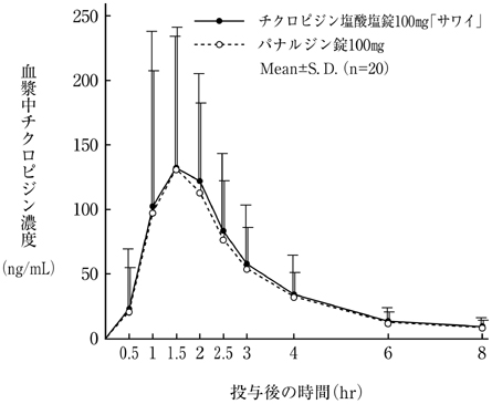 チクロピジン塩酸塩錠100mg「サワイ」とパナルジン錠100mgを健康成人男子にそれぞれ1錠(チクロピジン塩酸塩として100mg)空腹時単回経口投与(クロスオーバー法)し、血漿中チクロピジン濃度を測定した。得られた薬物動態パラメータ(AUC、Cmax)について統計解析を行った結果、両剤の生物学的同等性が確認された1)。