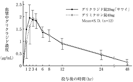 グリクラジド錠20mg「サワイ」とグリミクロン錠40mgを健康成人男子にそれぞれグリクラジドとして40mg空腹時単回経口投与(クロスオーバー法)し、血漿中グリクラジド濃度を測定した。得られた薬物動態パラメータ(AUC、Cmax)について統計解析を行った結果、両剤の生物学的同等性が確認された4)。