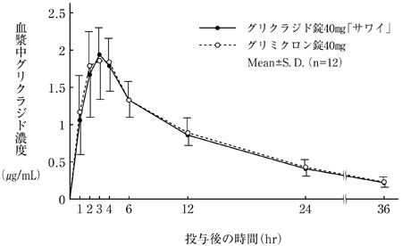 グリクラジド錠40mg「サワイ」とグリミクロン錠40mgを健康成人男子にそれぞれ1錠(グリクラジドとして40mg)空腹時単回経口投与(クロスオーバー法)し、血漿中グリクラジド濃度を測定した。得られた薬物動態パラメータ(AUC、Cmax)について統計解析を行った結果、両剤の生物学的同等性が確認された5)。