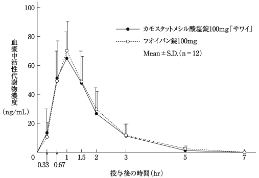 カモスタットメシル酸塩錠100mg「サワイ」とフオイパン錠100mgを健康成人男子にそれぞれ2錠(カモスタットメシル酸塩として200mg)空腹時単回経口投与(クロスオーバー法)し、活性代謝物である4-(4-グアニジノベンゾイルオキシ)フェニル酢酸の血漿中濃度を測定した。得られた薬物動態パラメータ(AUC、Cmax)について統計解析を行った結果、両剤の生物学的同等性が確認された3)。