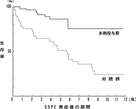 亜急性硬化性全脳炎(SSPE)患者を対象とした遡及的調査において、本剤を89例に1日26~190mg/kg、37日~5年1ヵ月間投与したところ、下図に示すとおり、本剤非投与62例(対照群)に比し、生存期間の延長がみられた。また、臨床経過の総合判定においては、経過良好以上が31.4%(27/86例)であった。