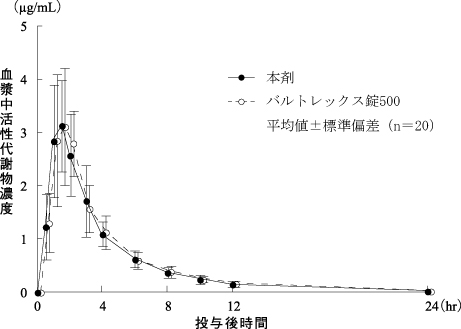 本剤とバルトレックス錠500を、クロスオーバー法によりそれぞれ1包又は1錠(バラシクロビルとして500mg)健康成人男性に絶食単回経口投与して血漿中活性代謝物(アシクロビル)濃度を測定し、得られた薬物動態パラメータ(AUC、Cmax)について90%信頼区間法にて統計解析を行った結果、log(0.80)~log(1.25)の範囲内であり、両剤の生物学的同等性が確認された6)。