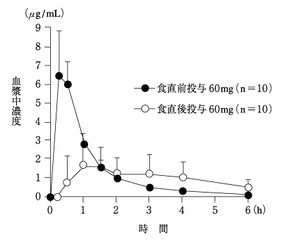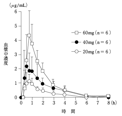 健康成人男性(n=6)に空腹時ナテグリニド20、40、60mgを経口投与したとき注)、投与後0.9~1.8時間で最高値に達し、半減期は1.1~1.3時間であった1)。