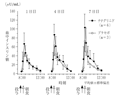 2型糖尿病患者(23例)を対象に、本剤1回90mg(120mgに増量可能)を1日3回毎食直前52週間経口投与した結果、効果の持続が確認され、安定した血糖コントロールが得られた。副作用の発現は認められなかった9)。