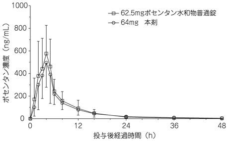 健康成人16例を対象にクロスオーバー法により、ボセンタン水和物普通錠(ボセンタンとして125mg)を空腹時又は食後に単回経口投与した時、空腹時に比べ食後投与時のAUC0-∞、Cmaxはそれぞれ10%、22%上昇したが、臨床的影響はないと考えられた3)(外国人データ)。