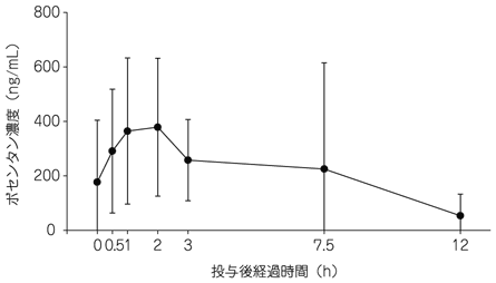 数値は幾何平均値(95%信頼区間)、tmaxは中央値(最小値 - 最大値)全血中のボセンタン濃度をヘマトクリット値で補正し、血漿中ボセンタン濃度を算出した。