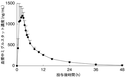 健康成人24例にミグルスタット100mgを食後及び絶食下で単回経口投与し、投与後36時間まで経時的に血漿中濃度を測定したときの薬物動態パラメータは下表の通りであった。食後投与では、絶食下投与と比較してCmaxは36%低下し、AUC0-∞は14%低下した。2)(外国人データ)