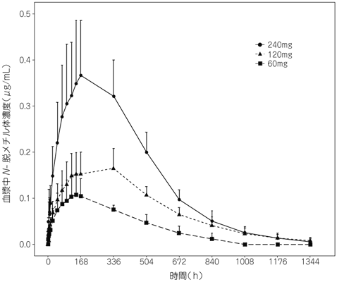 健康成人に本剤60注)~240mgを単回経口投与したとき、アパルタミド及び活性代謝物(N-脱メチル体)のCmax及びAUCinfは、概ね用量に比例して増加した1)。