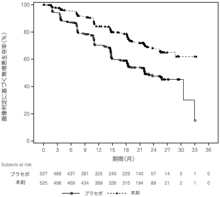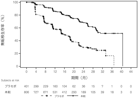 前立腺特異抗原(PSA)倍加時間が10ヵ月以下注1)の遠隔転移を有しない去勢抵抗性前立腺癌注2)患者を対象に、アンドロゲン除去療法(ADT)の併用下で、本剤とプラセボを比較することを目的とした二重盲検ランダム化試験が実施された(有効性解析対象例1207例、日本人55例)。本剤群では本剤240mgを1日1回連日経口投与した。主要評価項目は無転移生存期間(MFS)と設定された。MFSの最終解析(解析イベント数419)の結果、中央値は、本剤群40.51ヵ月、プラセボ群15.70ヵ月で、本剤群で統計学的に有意な延長を示した(ハザード比:0.297、95%信頼区間:0.244~0.362、層別log-rank検定:p<0.0001)。15)注1)ADTが行われている間にPSA値を少なくとも3回測定することとされ、PSA値の倍加時間が10ヵ月以下と算出された患者が組み入れられた。注2)①血清テストステロン値が50ng/dL未満、②PSA値が2.0ng/mL超、及び③1週間以上の測定間隔でPSA値の上昇が3回認められた去勢抵抗性前立腺癌患者が組み入れられた。なお、腸骨分岐部下の2cm未満の骨盤内リンパ節転移を有する患者は組入れ可能とされた。