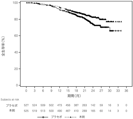 骨転移注1)を有し、ADT開始後6ヵ月以内注2)の前立腺癌注3)患者を対象に、ADT注4)の併用下で、本剤とプラセボを比較することを目的とした二重盲検ランダム化試験が実施された(有効性解析対象例1052例、日本人51例)。本剤群では本剤240mgを1日1回連日経口投与した。主要評価項目は全生存期間(OS)及び画像判定に基づく無増悪生存期間(rPFS)と設定された。OSの中間解析(解析イベント数200)の結果、両群ともに中央値は未到達であったものの、本剤群で統計学的に有意な延長を示した(ハザード比:0.671、95%信頼区間:0.507~0.890、層別log-rank検定:p=0.0053)。また、rPFSの中央値は本剤群未到達、プラセボ群22.08ヵ月で、本剤群で統計学的に有意な延長を示した(ハザード比:0.484、95%信頼区間:0.391~0.600、層別log-rank検定:p<0.0001)。16)注1)骨スキャンで1ヵ所以上の骨転移が確認された患者(骨病変が1ヵ所のみの場合は、CT又はMRIにおいても骨転移が確認された患者)が組み入れられた。内臓転移又はリンパ節転移のみを有する患者は除外された。注2)限局性前立腺癌に対するADT(ランダム化の1年前までに完了しており、合計3年以内の場合に限る)は許容された。注3)骨転移を有する前立腺癌に対する前治療歴として、①6サイクル以内のドセタキセル投与(最終投与がランダム化前2ヵ月以内であり、かつランダム化前に画像上の疾患進行又は血清PSA値の増加が認められていない場合に限る)、②1コースの放射線療法及び③手術は許容された。注4)外科的去勢術を実施していない場合には、ランダム化の14日以上前から内科的去勢術を開始することとされた。