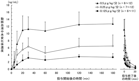 日本人患者36例にレミフェンタニルとして0.25、0.5、1.0及び2.0μg/kgを1分間かけて単回静脈内投与したとき、また、日本人患者37例にレミフェンタニルとして0.125、0.25、0.5及び1.0μg/kg/分を持続静脈内投与したとき、動脈血液中未変化体濃度はそれぞれ2相性の消失を示した。各相における半減期は、単回静脈内投与時において0.6~1.3分(t1/2α)及び6.7~11.5分(t1/2β)、また、持続静脈内投与時においては1.3~2.3分(t1/2α)及び12.6~16.5分(t1/2β)であり、用量並びに投与方法にかかわらずほぼ一定であった。また、両投与方法における最高血液中濃度(Cmax)及び血液中濃度-時間曲線下面積(AUC)は各用量範囲において用量に比例して増加することが示された。8)