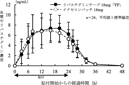 リバスチグミンテープ18mg「YP」とイクセロンパッチ18mgを、クロスオーバー法によりそれぞれ1枚(リバスチグミンとして18mg)健康成人男子の背部に24時間単回貼付して血漿中リバスチグミン濃度を測定し、得られた薬物動態パラメータ(AUC、Cmax)について90%信頼区間法にて統計解析を行った結果、log(0.80)~log(1.25)の範囲内であり、両製剤の生物学的同等性が確認された2)。