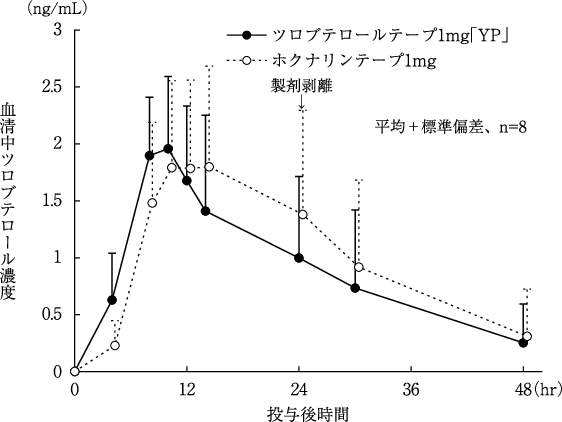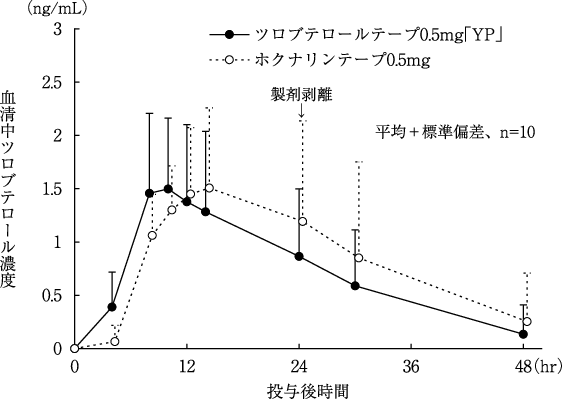 ツロブテロールテープ0.5mg「YP」とホクナリンテープ0.5mgを、クロスオーバー法にてそれぞれ4枚(ツロブテロールとして2mg)健康成人男子に24時間単回経皮投与して血清中のツロブテロール濃度を測定し、得られた薬物動態パラメータ(AUC0~48、Cmax)について統計解析を行った結果、両剤の生物学的同等性が確認された3)。