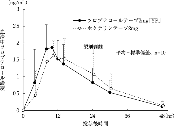 ツロブテロールテープ2mg「YP」とホクナリンテープ2mgを、クロスオーバー法にてそれぞれ1枚(ツロブテロールとして2mg)健康成人男子に24時間単回経皮投与して血清中のツロブテロール濃度を測定し、得られた薬物動態パラメータ(AUC0~48、Cmax)について統計解析を行った結果、両剤の生物学的同等性が確認された3)。