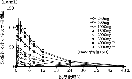 健康成人にレベチラセタム250、500、1000、1500、2000、3000、4000注1)、5000mg注1)(各投与量6例)を空腹時に単回経口投与したとき、すべての投与量でレベチラセタムの血漿中濃度は投与後ほぼ1時間に最高値を示し、消失半減期(t1/2)は投与量にかかわらず7~9時間であった3)。