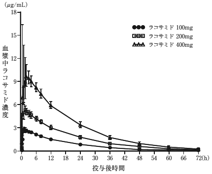 健康成人男性18例にラコサミド100、200、400mgを空腹時に単回経口投与したとき、投与後0.5~4時間でCmaxに達し、t1/2は約14時間であった。AUC及びCmaxは投与量に比例して増加した3) 。