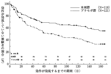 既存の抗てんかん薬で十分な発作抑制効果が得られない強直間代発作を有する4歳以上のてんかん患者242例(日本人患者30例を含む)を対象として、本剤(体重30kg未満の小児患者は8~12mg/kg/日、体重30~50kg未満の小児患者は6~8mg/kg/日、体重50kg以上の小児及び成人患者は300~400mg/日)又はプラセボを最長で24週間経口投与(既存の抗てんかん薬1~3剤との併用)したとき、主要評価項目である24週間の治療期間における2回目の強直間代発作が発現するまでの時間は下表及び下図のとおりであり、プラセボと本剤群との間で統計学的に有意な差が認められた23) 。