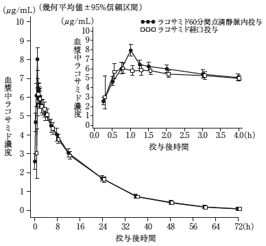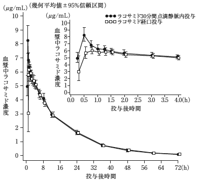日本人健康成人にラコサミド200mgを30分間又は60分間点滴静脈内投与又は経口投与したとき、ラコサミドの血漿中濃度推移及び薬物動態パラメータは以下のとおりであった。経口投与時と比較して、点滴静脈内投与時のAUC0-t及びCmaxは同程度であった。なお、ラコサミド錠の絶対バイオアベイラビリティはほぼ100%であった2) 。
