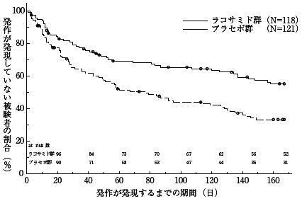 既存の抗てんかん薬で十分な発作抑制効果が得られない強直間代発作を有する4歳以上のてんかん患者242例(日本人患者30例を含む)を対象として、ラコサミド(体重30kg未満の小児患者は8~12mg/kg/日、体重30~50kg未満の小児患者は6~8mg/kg/日、体重50kg以上の小児及び成人患者は300~400mg/日)又はプラセボを最長で24週間経口投与(既存の抗てんかん薬1~3剤との併用)したとき、主要評価項目である24週間の治療期間における2回目の強直間代発作が発現するまでの時間は下表及び下図のとおりであり、プラセボとラコサミド群との間で統計学的に有意な差が認められた20) 。