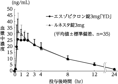 エスゾピクロン錠3mg「YD」とルネスタ錠3mgをクロスオーバー法によりそれぞれ1錠(エスゾピクロンとして3mg)、健康成人男子35名に絶食単回経口投与して血漿中未変化体濃度を測定した。得られた薬物動態パラメータ(AUC、Cmax)について90%信頼区間法にて統計解析を行った結果、log(0.80)~log(1.25)の範囲内であり、両剤の生物学的同等性が確認された2)。