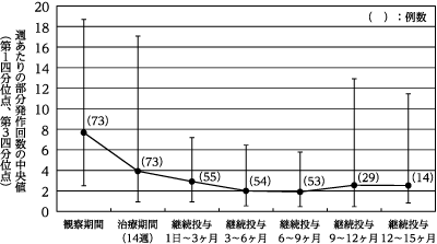 既存の抗てんかん薬で十分な発作抑制効果が得られない部分発作を有する4歳以上16歳未満の小児てんかん患者73例を対象として、レベチラセタム40又は60mg/kg/日(体重50kg以上は2000又は3000mg/日)を1日2回に分けて14週間経口投与(既存の抗てんかん薬との併用)したとき、主要評価項目である観察期間からの週あたりの部分発作回数減少率の中央値(95%信頼区間)は、43.21%(26.19%,52.14%)であり、発作頻度の減少が認められた。また、小児てんかん患者55例に14週以降もレベチラセタム20~60mg/kg/日(体重50kg以上は1000~3000mg/日)を1日2回に分けて継続投与したときの部分発作回数は以下のとおりであった。