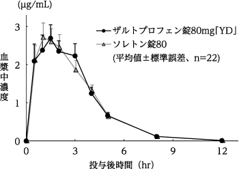 ザルトプロフェン錠80mg「YD」とソレトン錠80をクロスオーバー法によりそれぞれ1錠(ザルトプロフェンとして80mg)、健康成人男子22名に絶食単回経口投与して血漿中未変化体濃度を測定した。得られた薬物動態パラメータ(AUC、Cmax)について統計解析を行った結果、両剤の生物学的同等性が確認された11)。