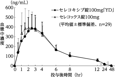 セレコキシブ錠100mg「YD」とセレコックス錠100mgをクロスオーバー法によりそれぞれ1錠(セレコキシブとして100mg)、健康成人男子29名に絶食単回経口投与して血漿中未変化体濃度を測定した。得られた薬物動態パラメータ(AUC、Cmax)について90%信頼区間法にて統計解析を行った結果、log(0.80)~log(1.25)の範囲内であり、両剤の生物学的同等性が確認された9)。