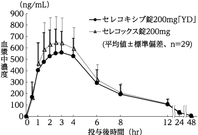 セレコキシブ錠200mg「YD」とセレコックス錠200mgをクロスオーバー法によりそれぞれ1錠(セレコキシブとして200mg)、健康成人男子29名に絶食単回経口投与して血漿中未変化体濃度を測定した。得られた薬物動態パラメータ(AUC、Cmax)について90%信頼区間法にて統計解析を行った結果、log(0.80)~log(1.25)の範囲内であり、両剤の生物学的同等性が確認された10)。