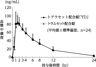 トアラセット配合錠「YD」とトラムセット配合錠をクロスオーバー法によりそれぞれ1錠(アセトアミノフェンとして325mg)、健康成人男子24名に絶食単回経口投与して血漿中未変化体濃度を測定した。得られた薬物動態パラメータ(AUC、Cmax)について90%信頼区間法にて統計解析を行った結果、log(0.80)~log(1.25)の範囲内であり、両剤の生物学的同等性が確認された2)。